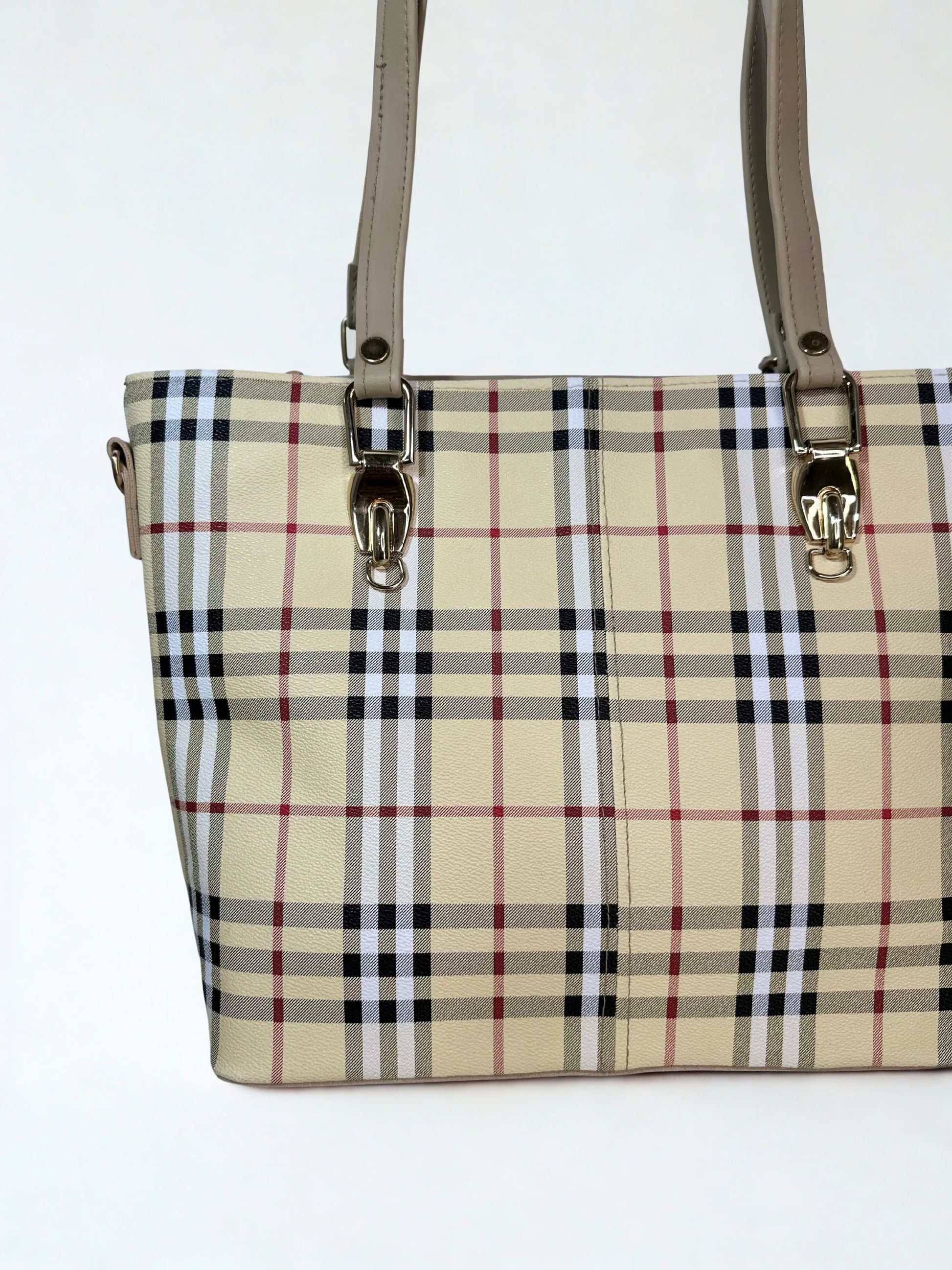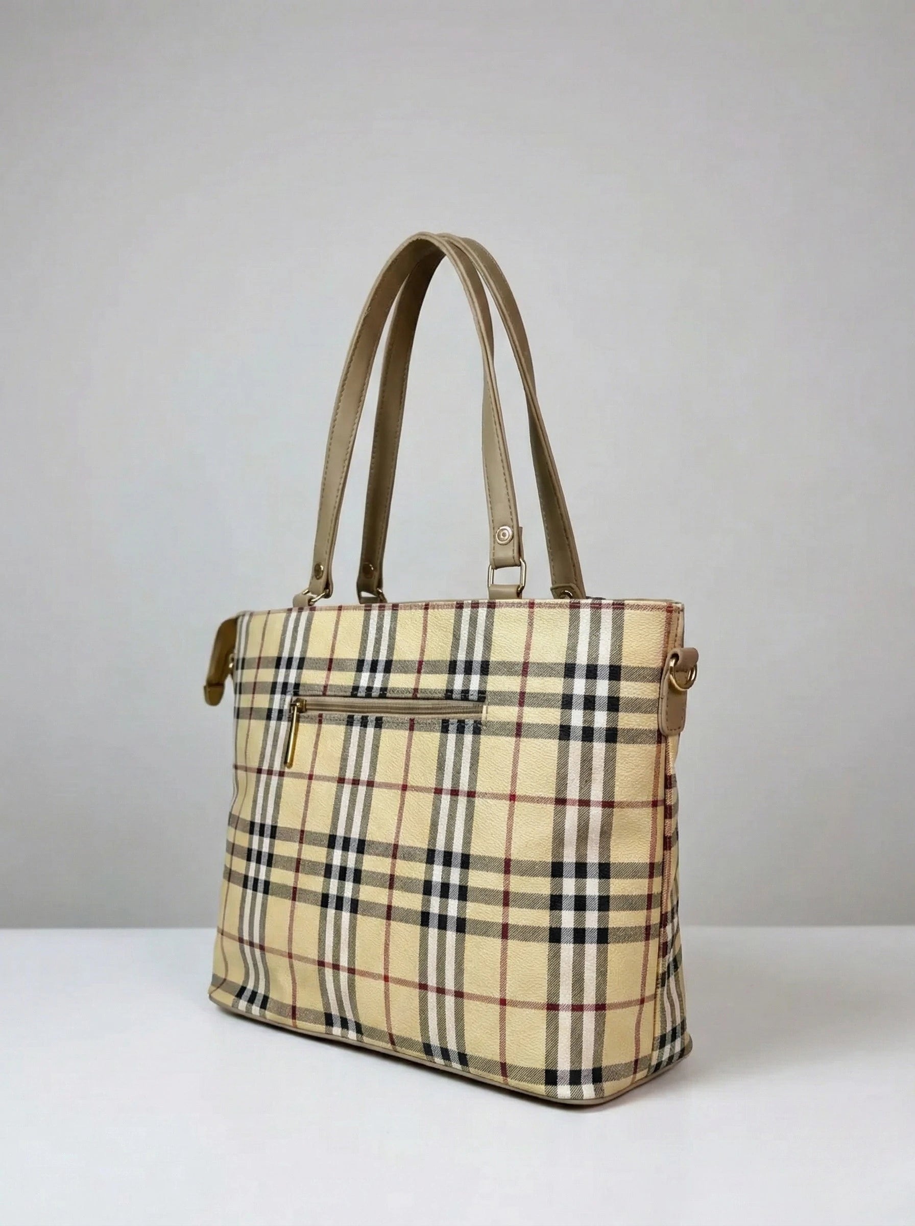 A premium spacious tote featuring a timeless beige plaid pattern and sturdy handles—perfect for a sophisticated, classic look while keeping all your essentials organized and within reach.