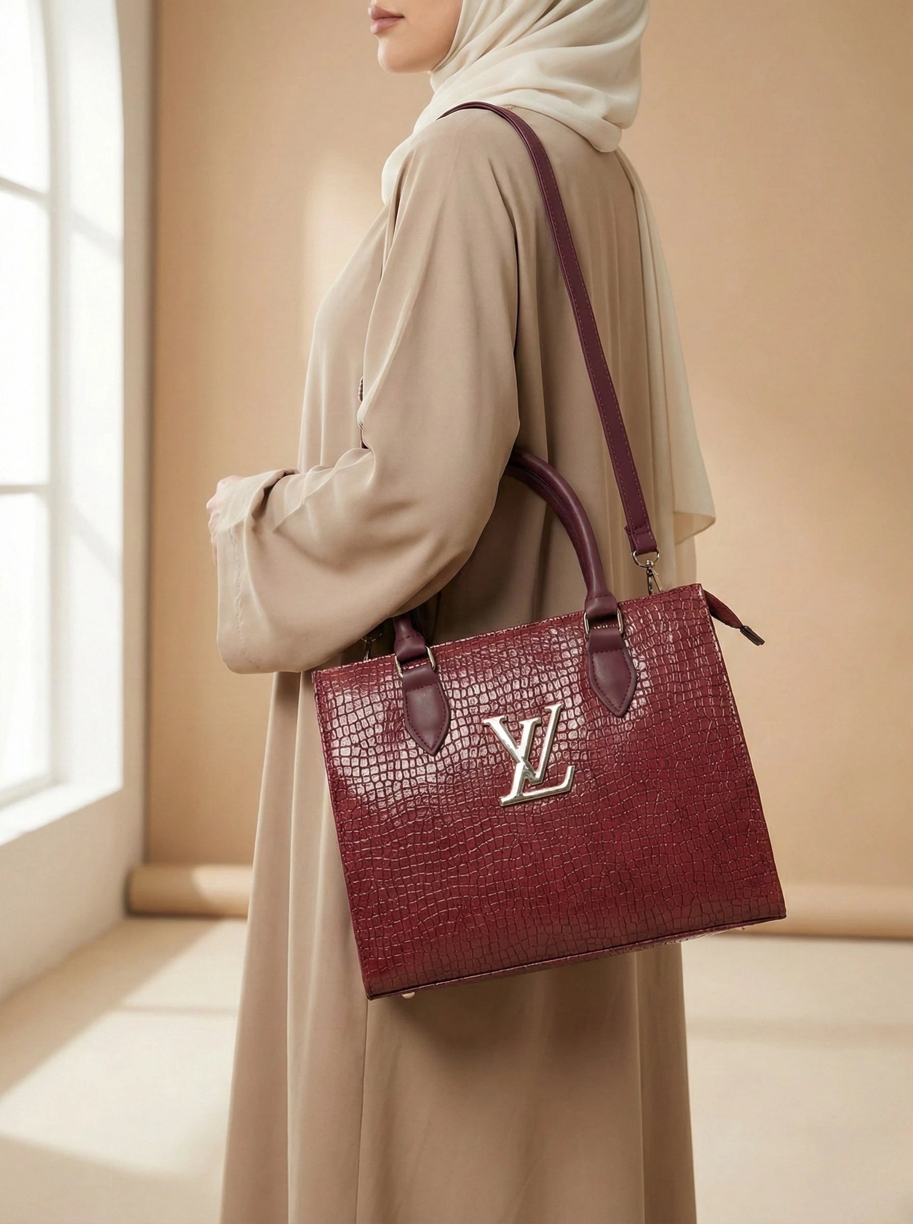 A premium glossy maroon tote featuring a high-shine crocodile-embossed texture and a sleek, structured silhouette—perfect for sophisticated evening wear or a commanding business look.