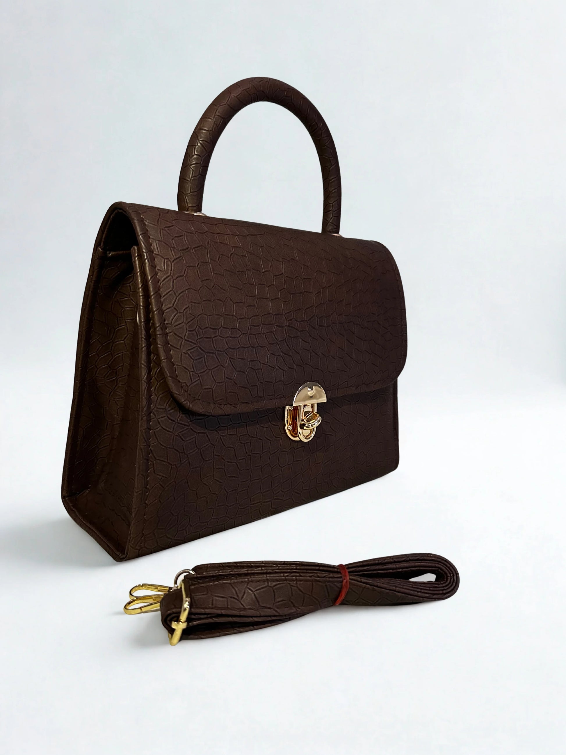 Crafted with a luxurious croc-embossed texture and a sophisticated chocolate brown finish, this structured handbag is the ultimate style statement. The polished gold-tone clasp adds a touch of classic elegance, while the versatile design allows it to be carried by the top handle or worn as a crossbody. It's the perfect accessory to elevate any look, day or night.