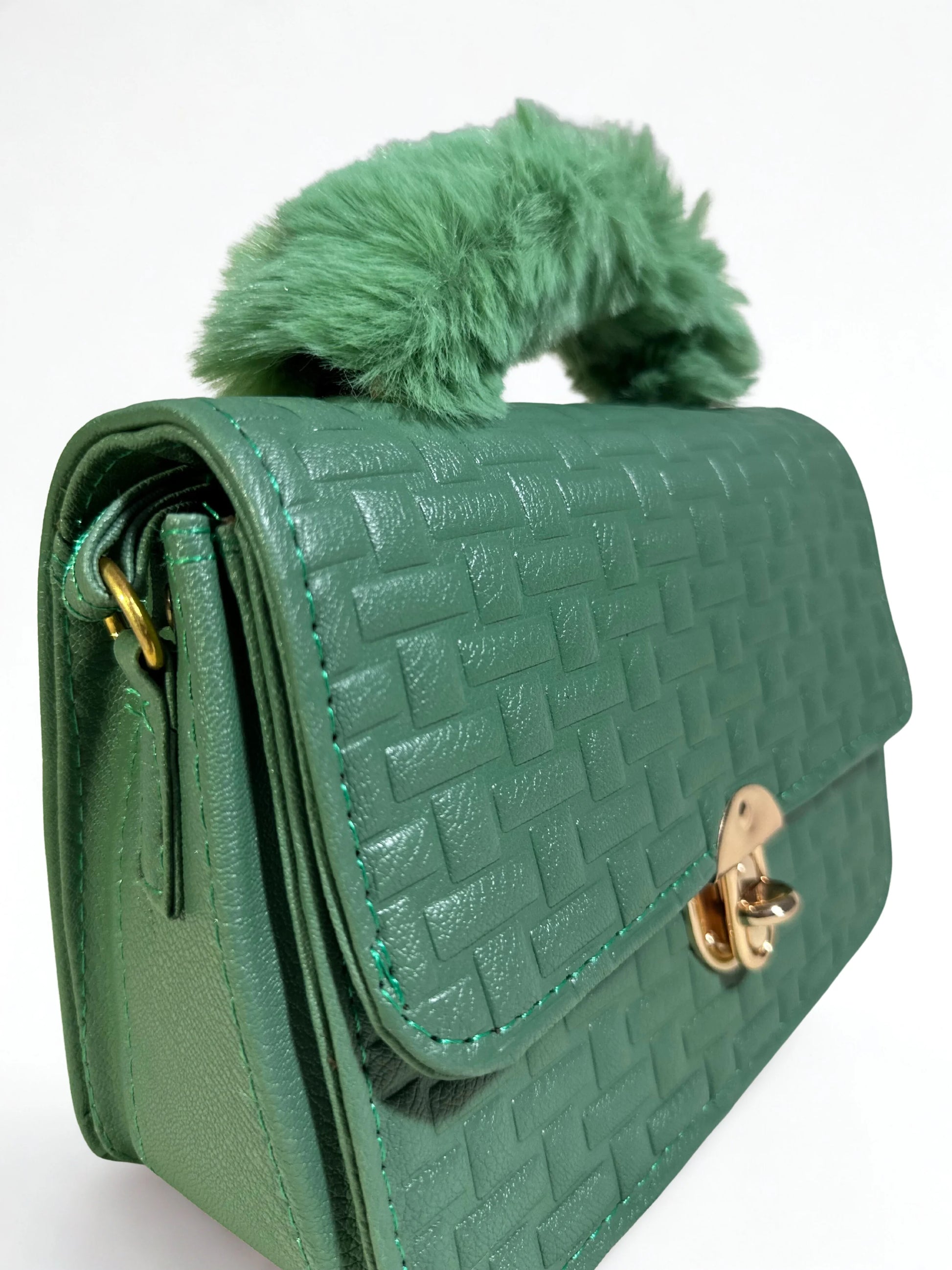 Add a fresh pop of style to your look with this elegant green handbag, crafted from premium quality hard material for long-lasting durability. Its embossed geometric pattern makes it stand out, while the soft fur handle adds a touch of charm and sophistication.