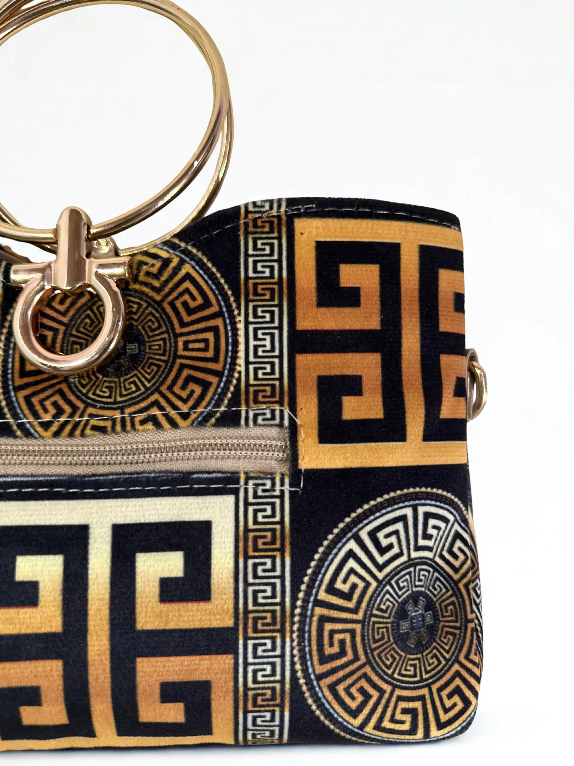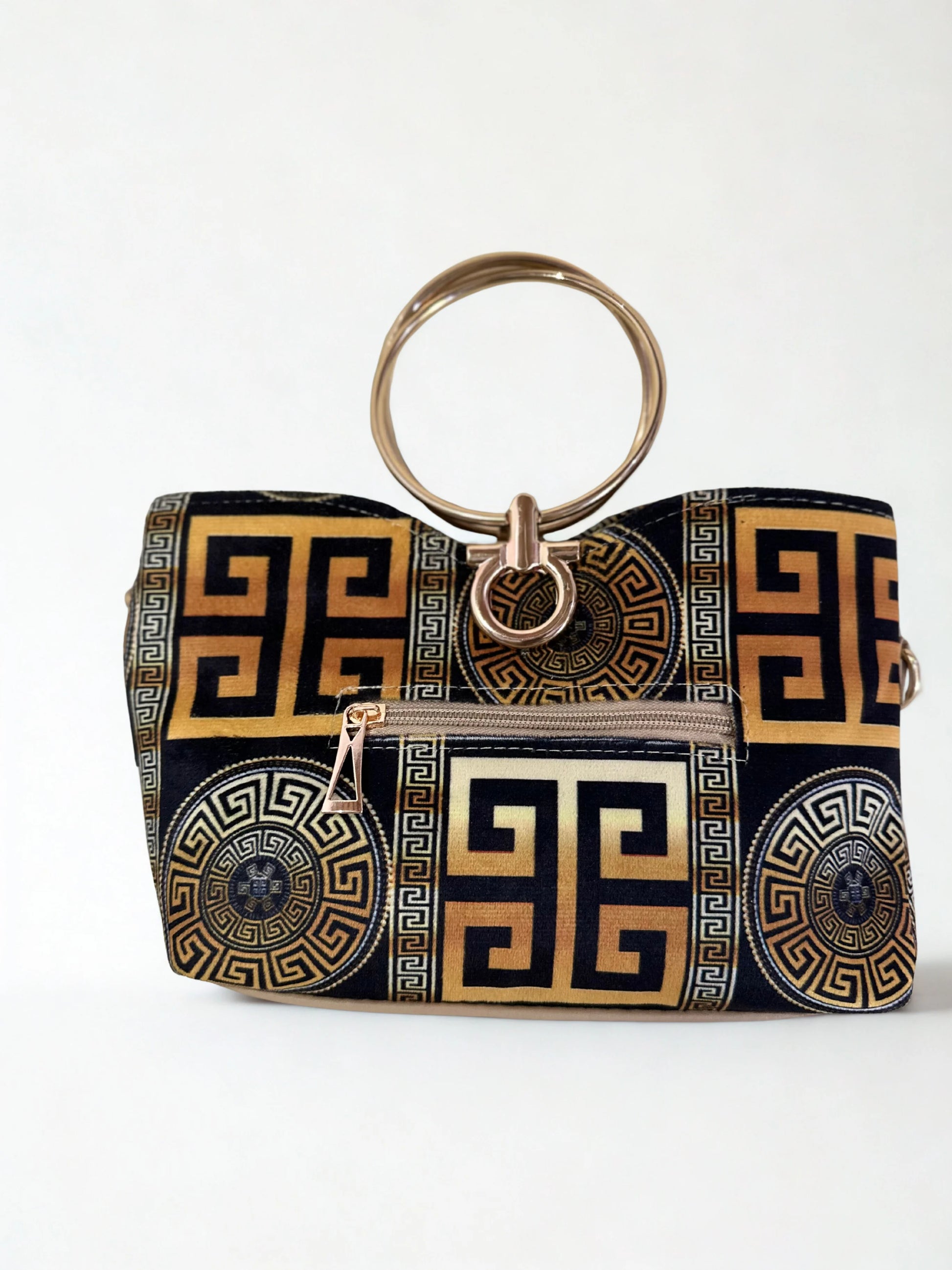 Turn heads with this elegant ladies handbag featuring a striking geometric pattern in gold and black. Designed with a modern steel ring handle, it’s perfect for adding a touch of sophistication to any outfit.